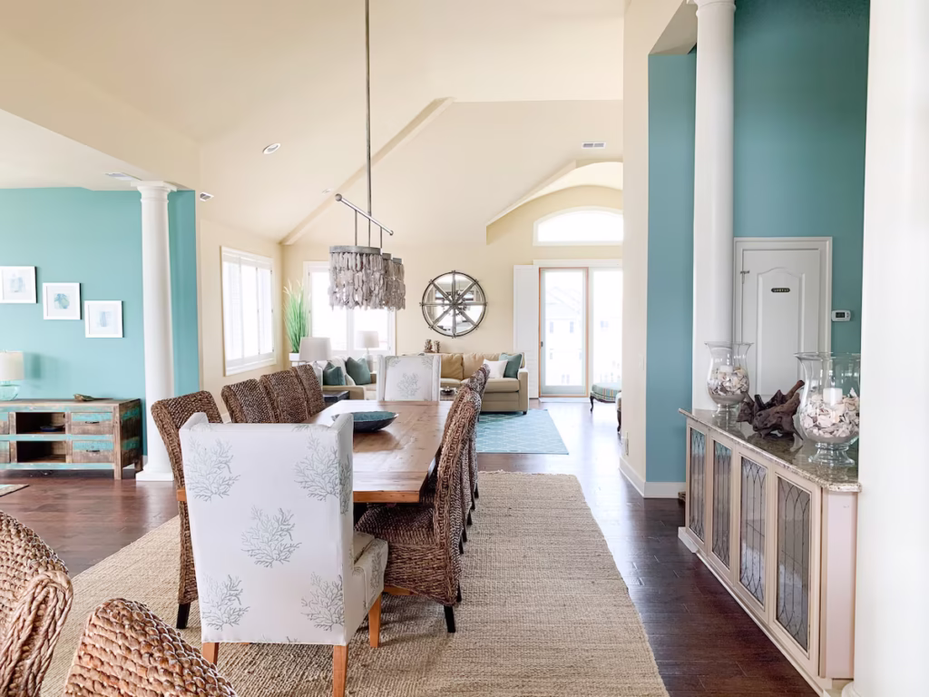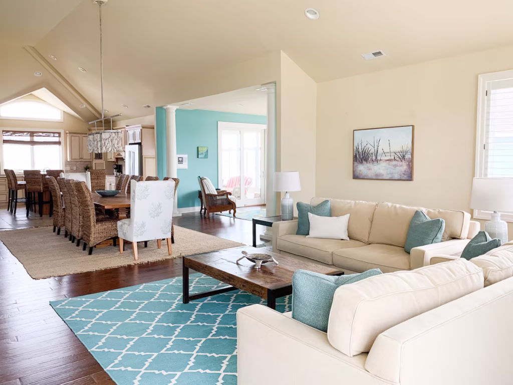 The six-bedroom, five full and two half bath Indian River Retreat Beach House is the perfect place for a family vacation. Located in the private gated community of South Shore Marina at the north end of Bethany Beach, this modern beach home offers both comfort and convenience. The house was professionally decorated and features an open floor plan on the main level for gathering, while multiple levels provide privacy and space for all guests.